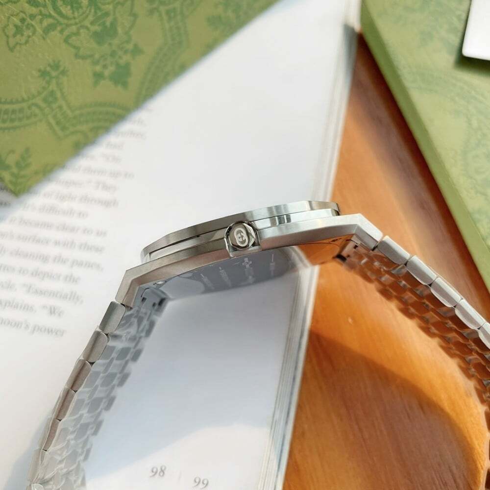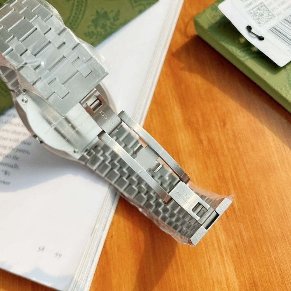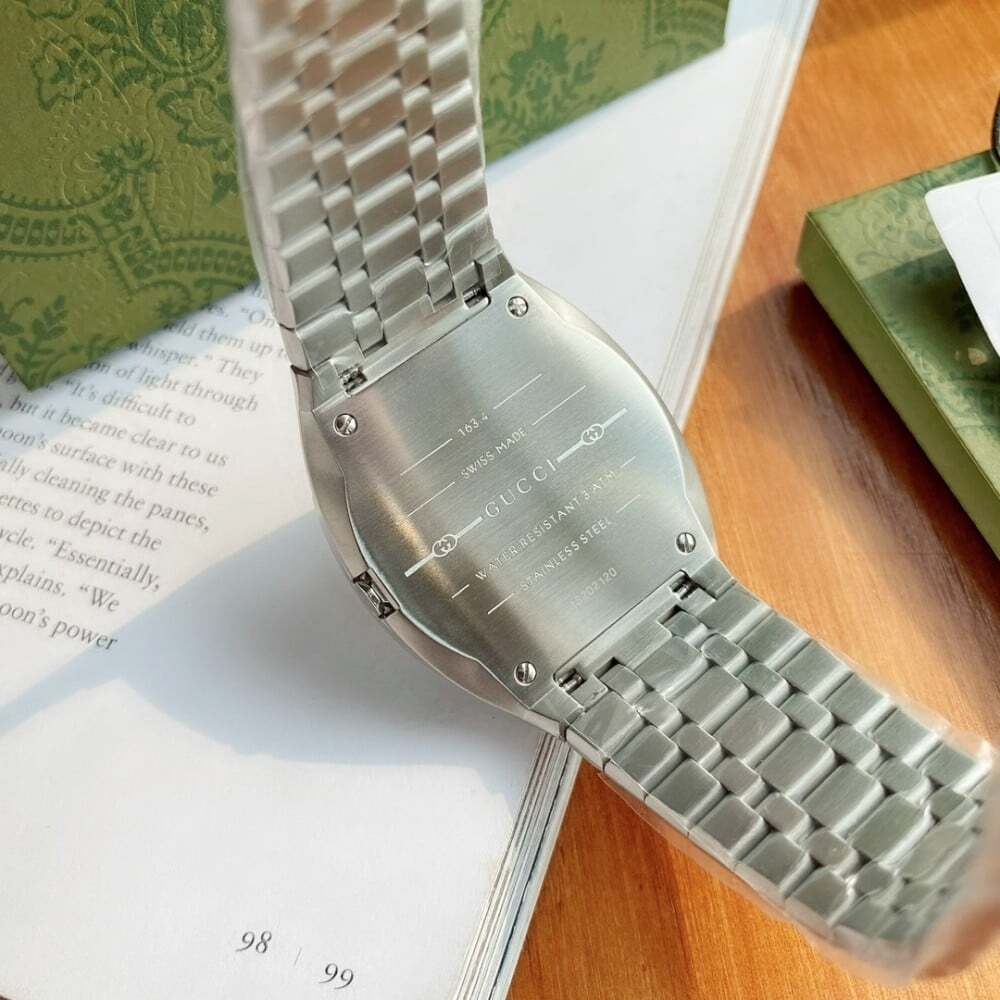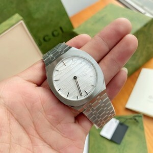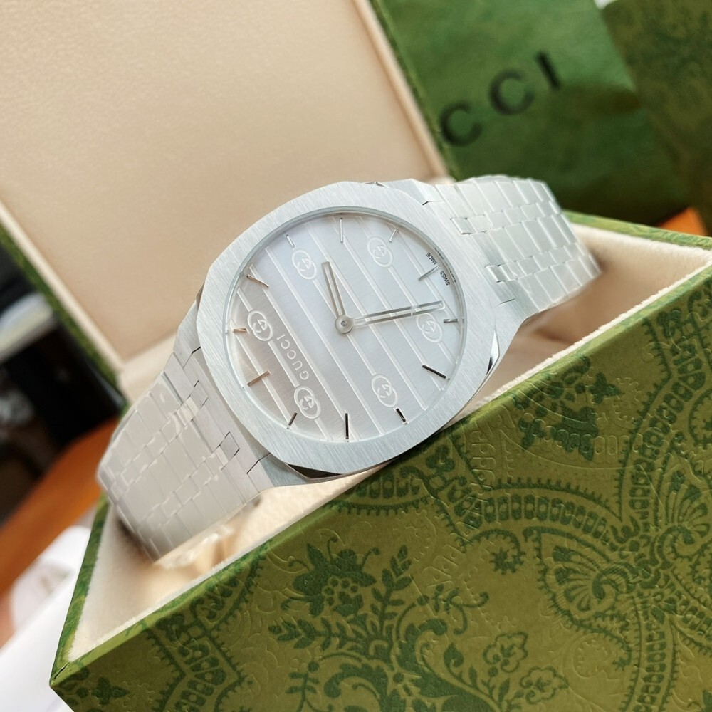 ساعة قوتشي H25 بتصميم راقٍ وميناء بلون ابيض المميز. تأتي بحجم 38 مم مع حركة كوارتز دقيقة وسوار معدني أنيق من الستانلس ستيل. جودة عالية (هاي كواليتي) مع ضمان سنة واحدة، مثالية لإطلالة فاخرة وعصرية.