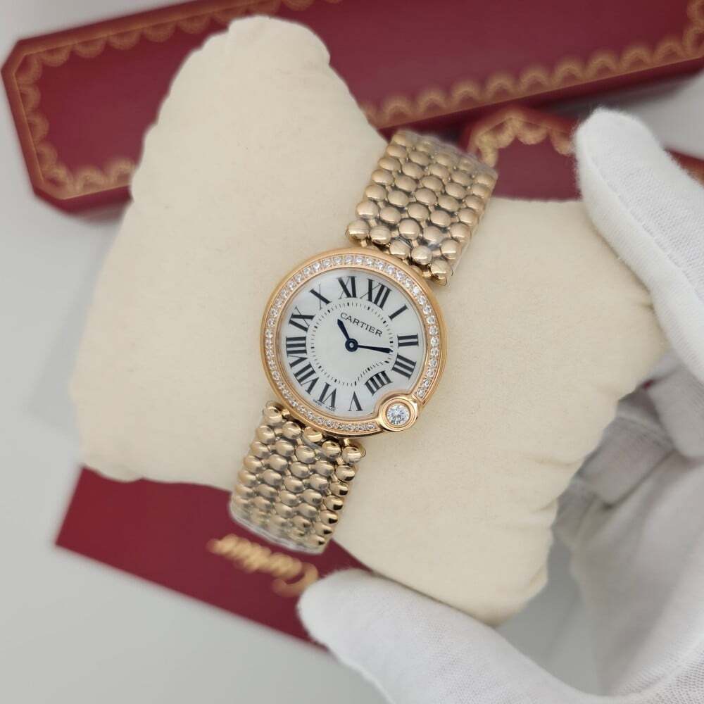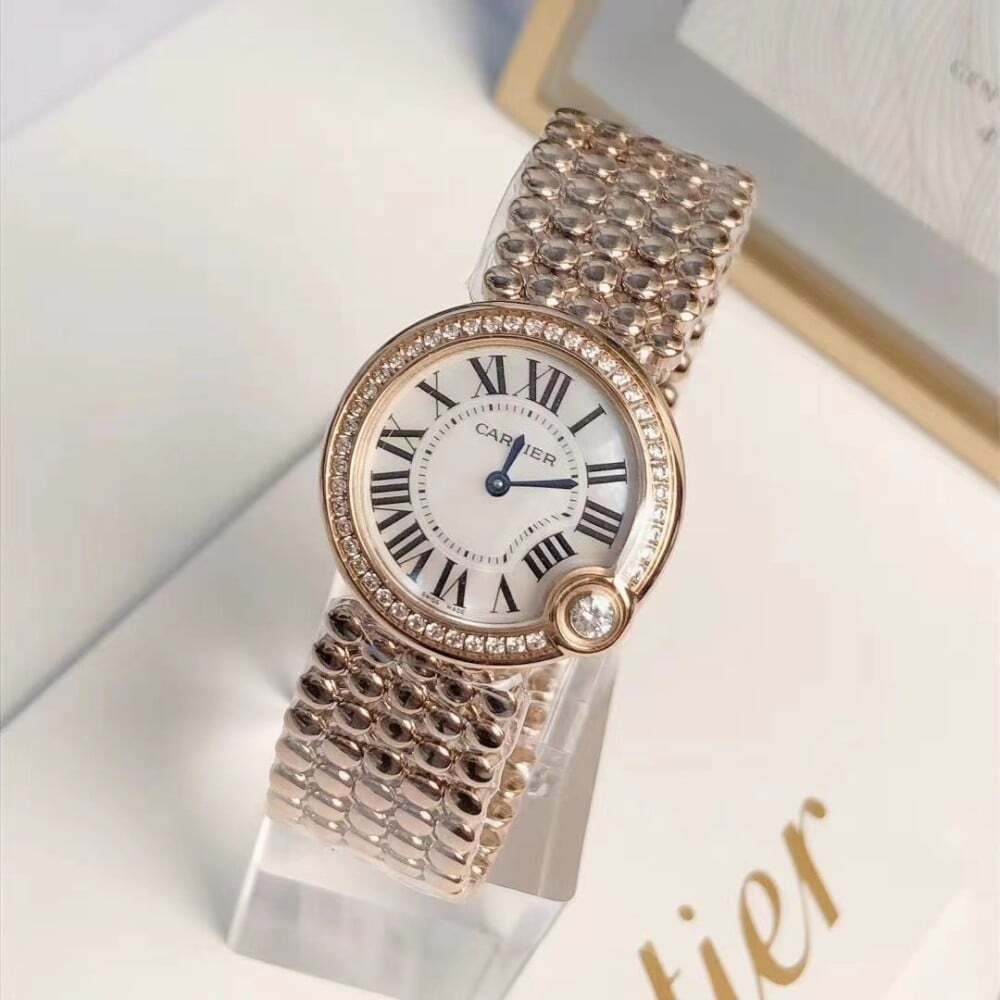 ساعة كارتييه بالون بلانس النسائية، تصميم فاخر بميناء أنيق مع تفاصيل كلاسيكية وسوار معدني لامع. تتميز بإطار مرصع بالأحجار اللامعة لتعكس الفخامة والأنوثة بأسلوب عصري.