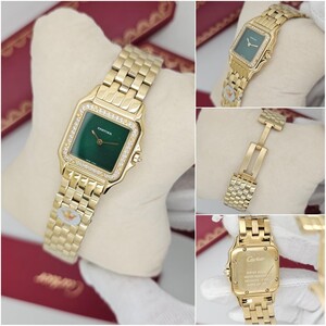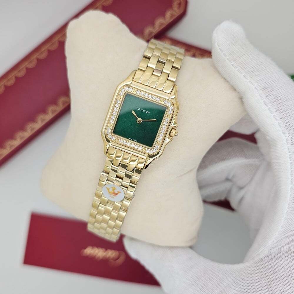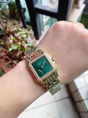 ساعة كارتييه بانثير الذهبية الفاخرة بتصميمها الأنيق والميناء الاخضر ، تضفي لمسة من الرقي والفخامة. سوار ستانلس ستيل ذهبي يعكس الرفاهية. جودة طبق الأصل عالية، مقاومة للماء مع ضمان سنة للأداء المثالي.