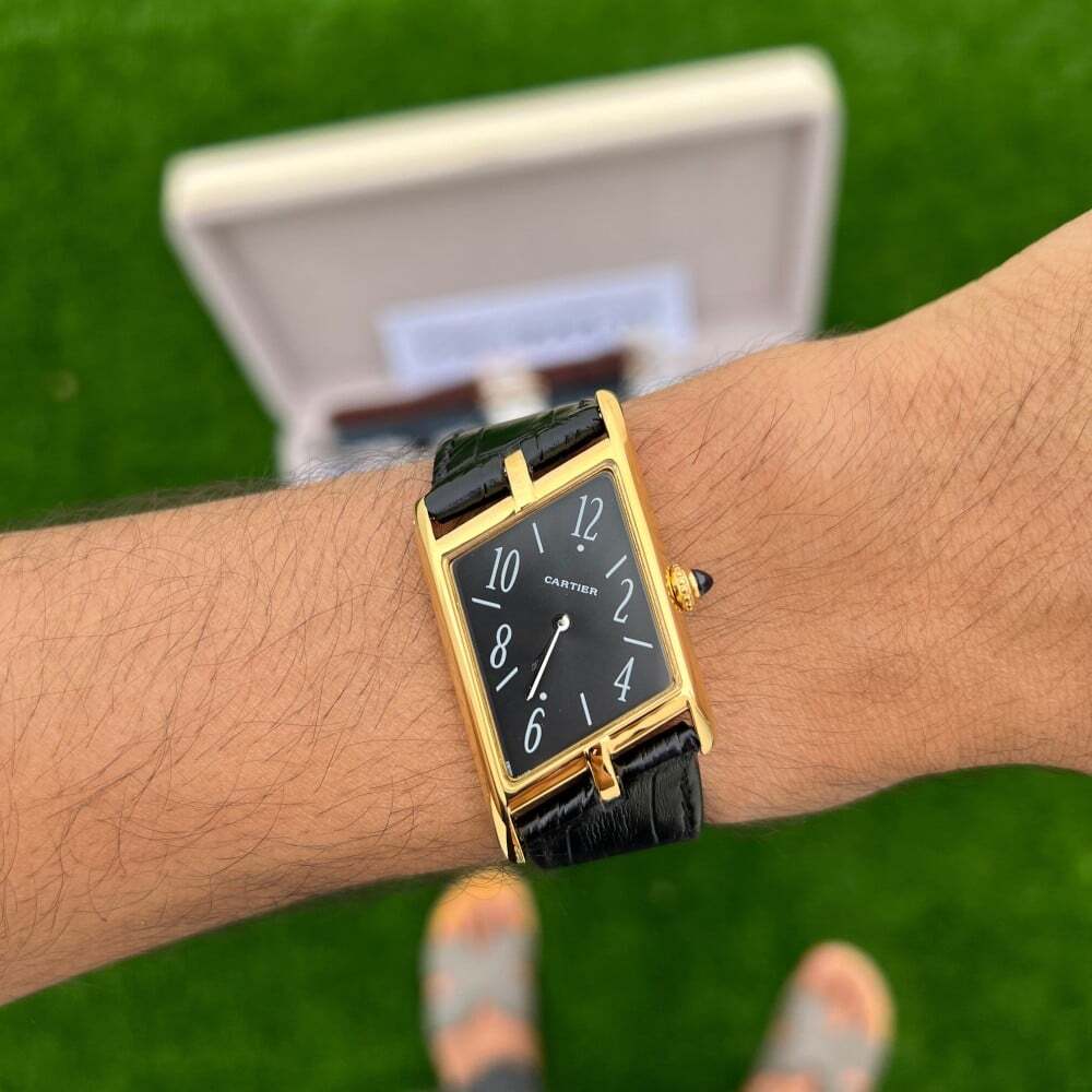 ساعة كارتييه تانك آسيميتريك بتصميم مائل أنيق وميناء أسود. مصنوعة بجودة عالية بحزام جلد فاخر، تعمل بمكينة كوارتز (بطارية) مع أبعاد 47×26×6.5 مم، وتناسب الإطلالات الفريدة.