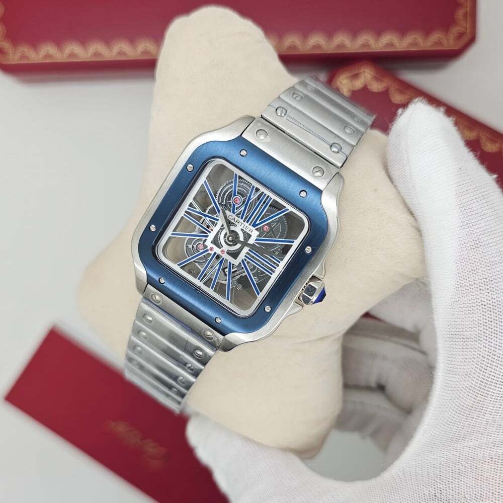 ساعة كارتييه سانتوس الرجالية، تصميم فاخر بأحدث إصدارات كارتييه. تعمل بحركة كوارتز (بطارية)، بمقاس رجالي كبير (39.8 مم). تتميز بهيكل من الستانلس ستيل ومكينة مكشوفة من الأمام والخلف، ما يبرز الأناقة الحرفية في أدق تفاصيلها.
