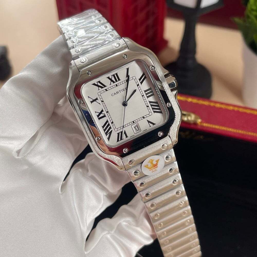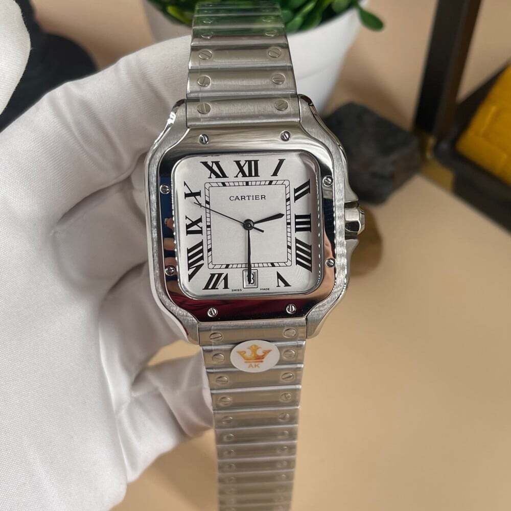 ساعة كارتييه سانتوس الرجالية، تصميم فاخر ومثالي يجمع بين الأداء العملي والجمال الكلاسيكي. تتميز بمكينة تعمل بالبطارية، هيكل من الستانلس ستيل، ميناء أبيض أنيق، وقطر 39.8 مم يناسب الأحجام الرجالية الكبيرة.