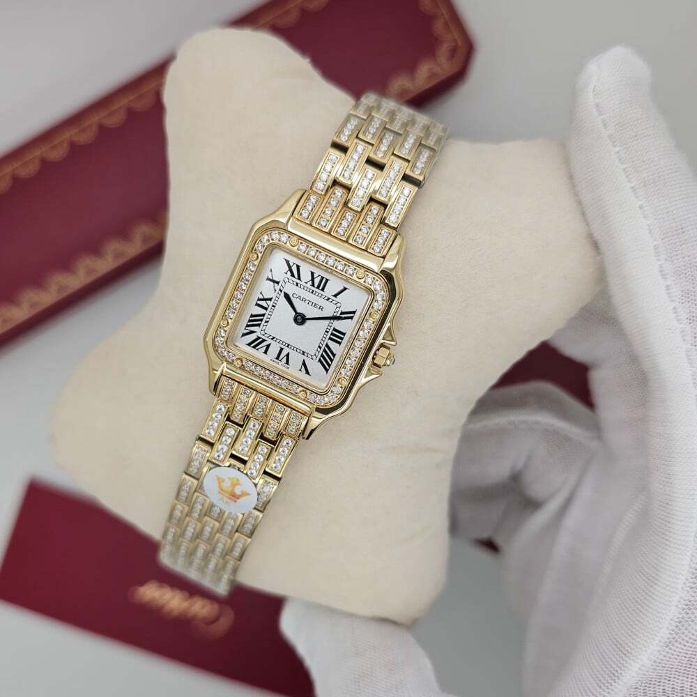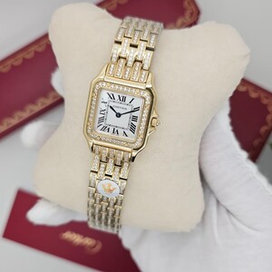 ساعة پانتير دو كارتييه النسائية تضفي لمسة من الفخامة بتصميمها المرصع بالكامل بفصوص الزركون. بأبعاد 27×37 مم، تتميز بمكينة كوارتز بطارية دقيقة، هيكل متين عالي الجودة وسوار أنيق. الخيار الأمثل للنساء الباحثات عن التميز. تشمل علبة، كيس، وكرت.ساعة پانتير