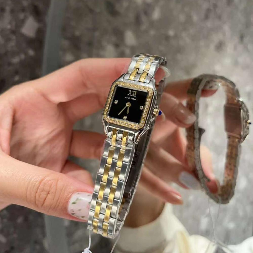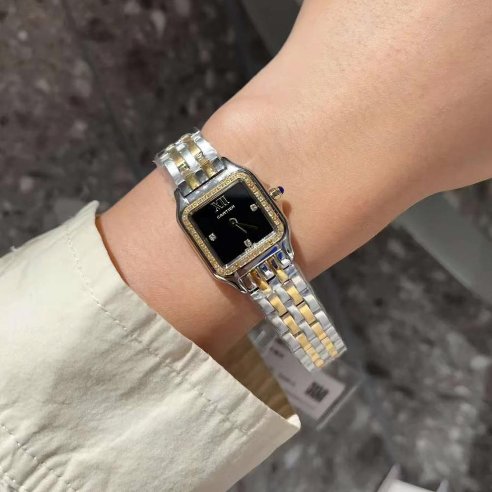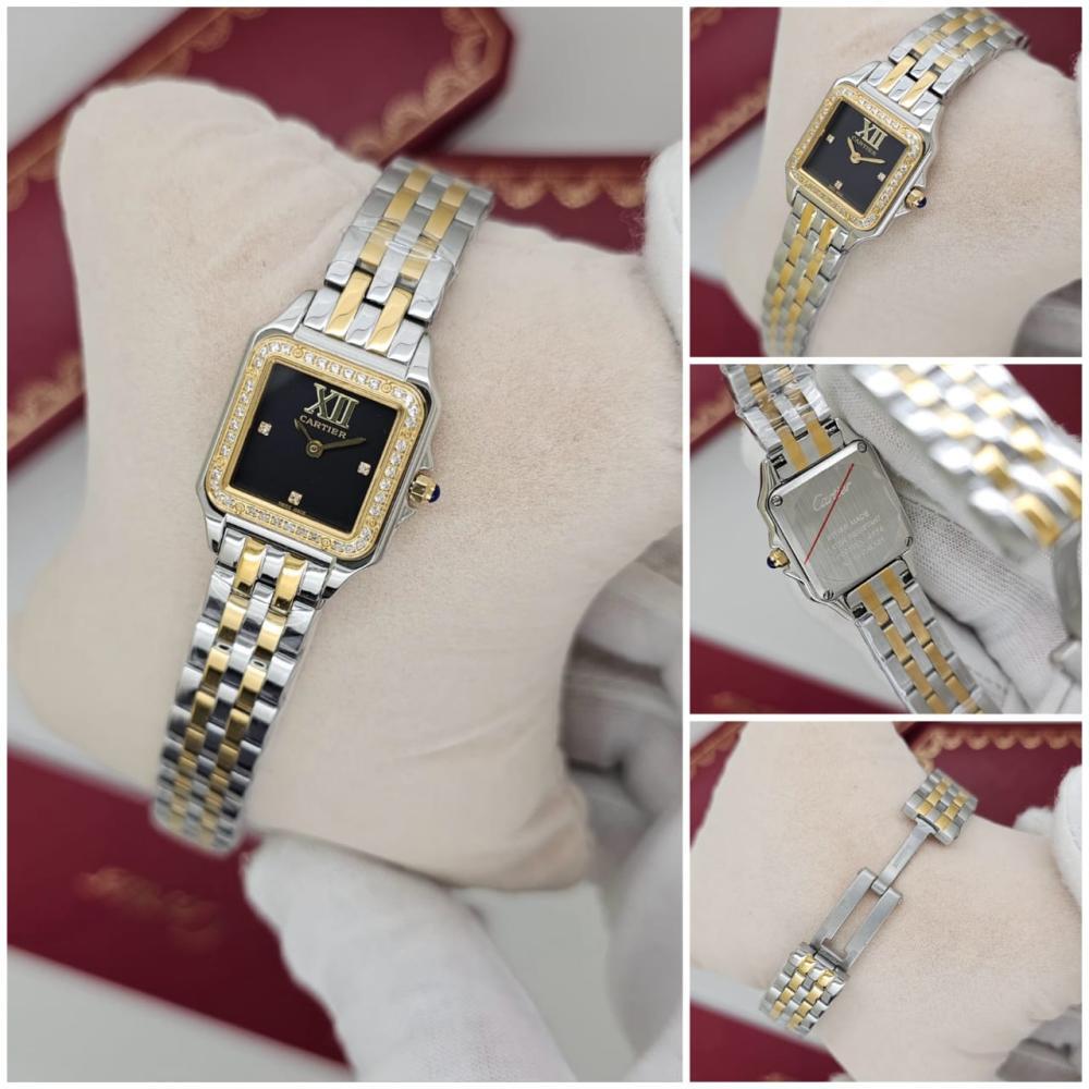 ساعة پانتير دو كارتييه النسائية، أيقونة الفخامة بتصميم مستطيل فاخر وأبعاد أنيقة (23×30مم). إطار مرصع بالأحجار اللامعة وميناء أسود كلاسيكي يعكس الأناقة العصرية. مصممة للسيدات اللاتي يبحثن عن التميز.