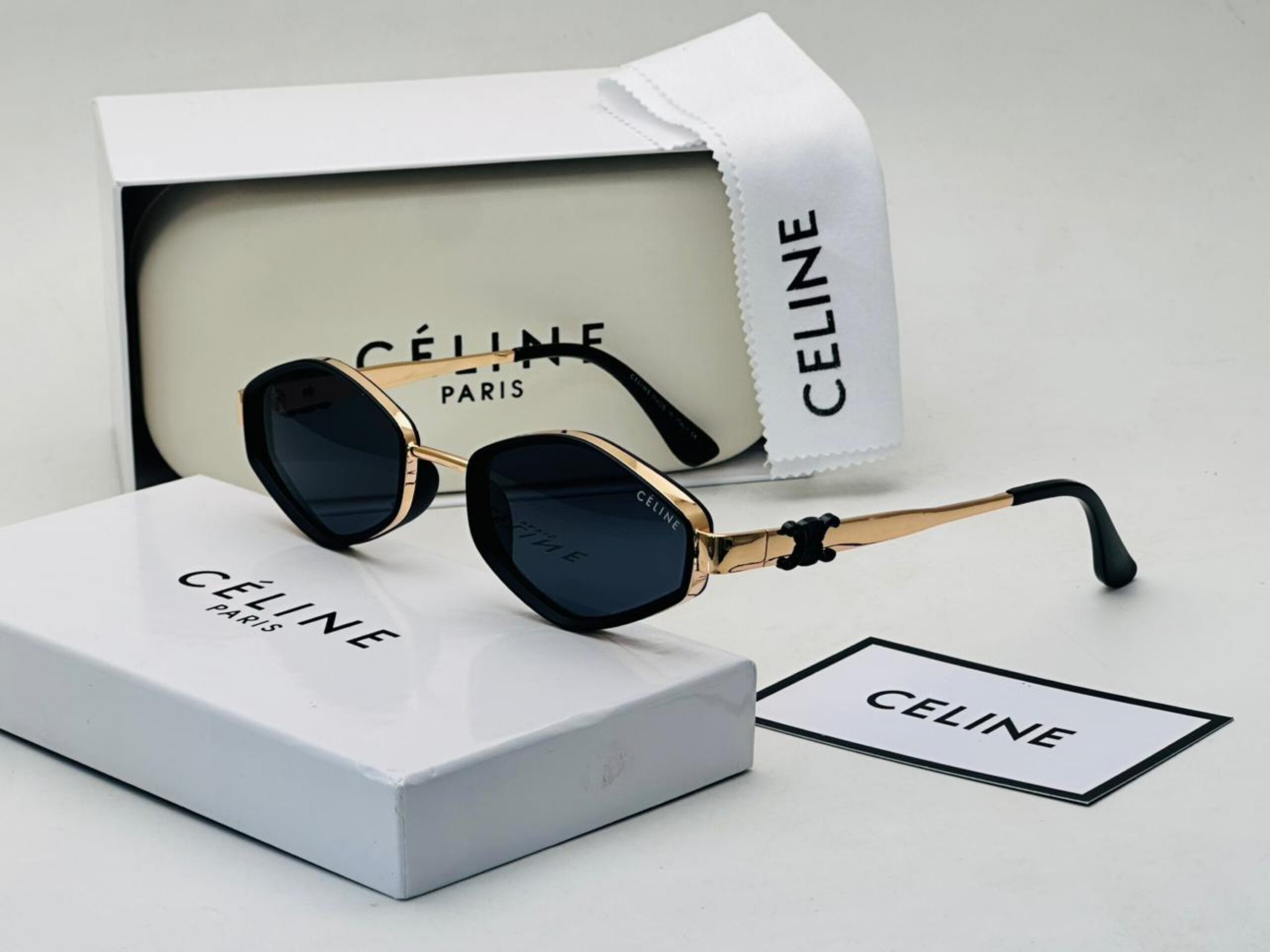 نظارة فاخرة من CELINE بإطار هندسي ذهبي وعدسات داكنة تمنح مظهراً راقياً. الذراع بلون ذهبي يتحول إلى أسود عند الأطراف. تأتي مع ملحقات الماركة بجودة A1:1 كوبي ون.