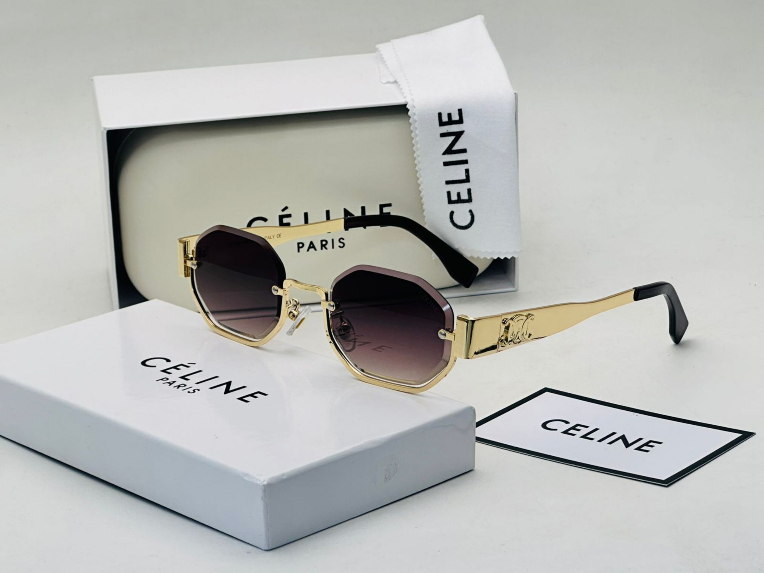 نظارة فاخرة من CELINE بإطار هندسي ذهبي وعدسات متدرجة بلون أزرق أنيق. الذراع مزود بزخرفة مميزة وينتهي بأطراف سوداء. تأتي مع ملحقات الماركة بجودة A1:1 كوبي ون.
