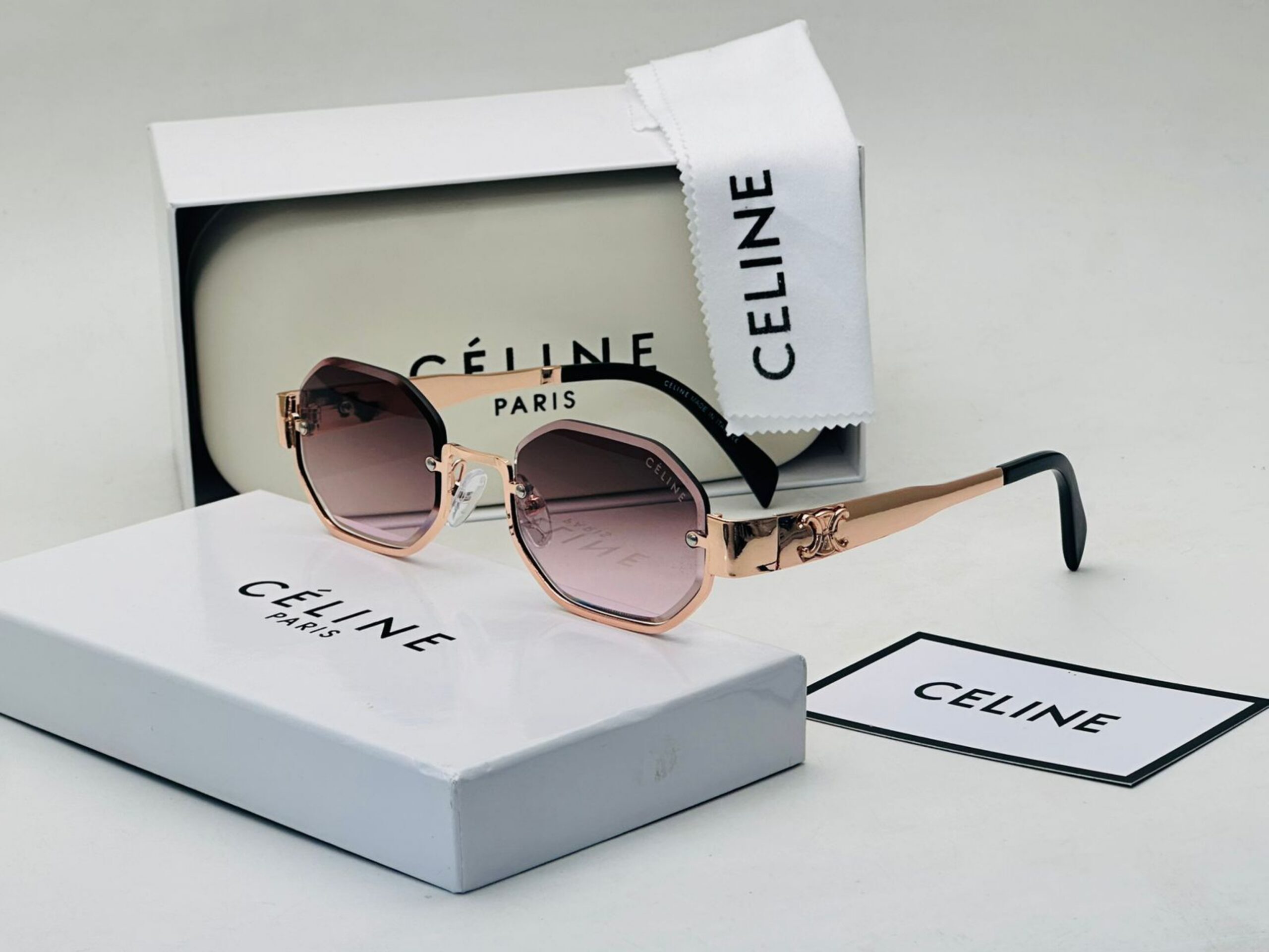 نظارة فاخرة من CELINE بإطار وردي ذهبي وعدسات داكنة تمنح مظهراً أنيقاً. الذراع مزود بزخرفة دقيقة وينتهي بأطراف سوداء. تأتي مع ملحقات الماركة بجودة A1:1 كوبي ون.