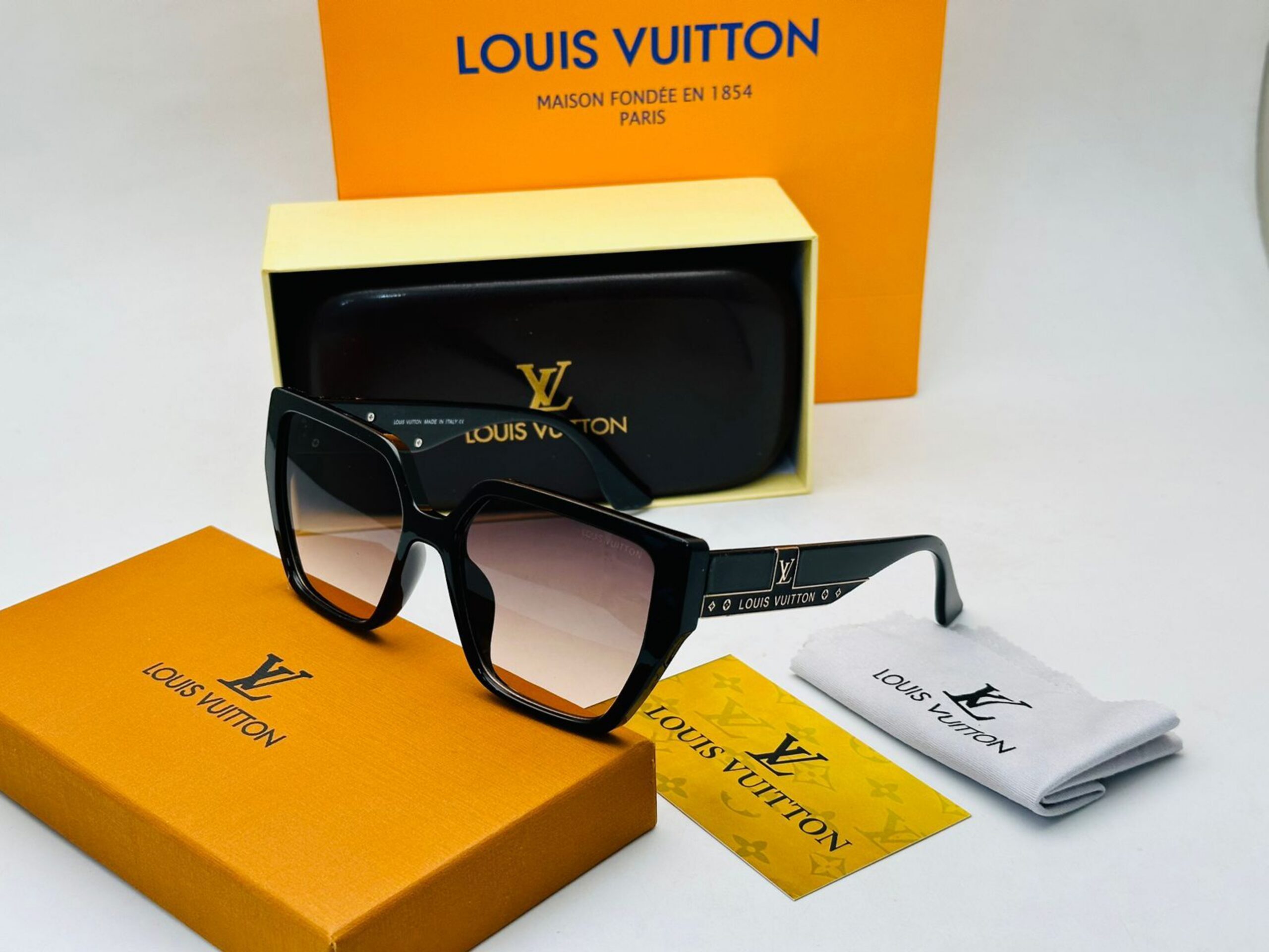نظارة شمسية بإطار أسود مدور مع زخارف نجمية، شعار CHRISTIAN DIOR على الذراع، تأتي مع ملحقات الماركة كاملة، جودة A1:1 كوبي ون.