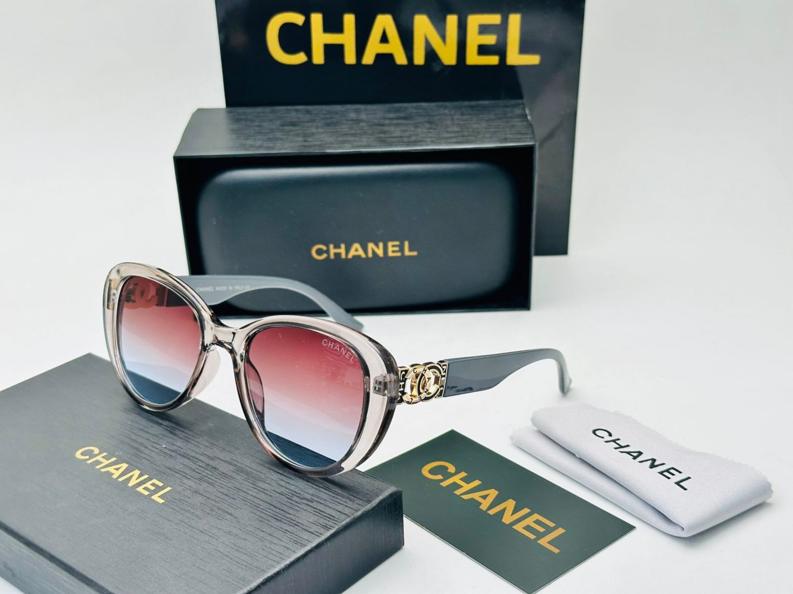 نظارة شمسية بإطار شفاف وعدسات متدرجة من الأحمر إلى الأزرق، شعار CHANEL ذهبي على الذراع، تأتي مع ملحقات الماركة كاملة، جودة A1:1 كوبي ون.
