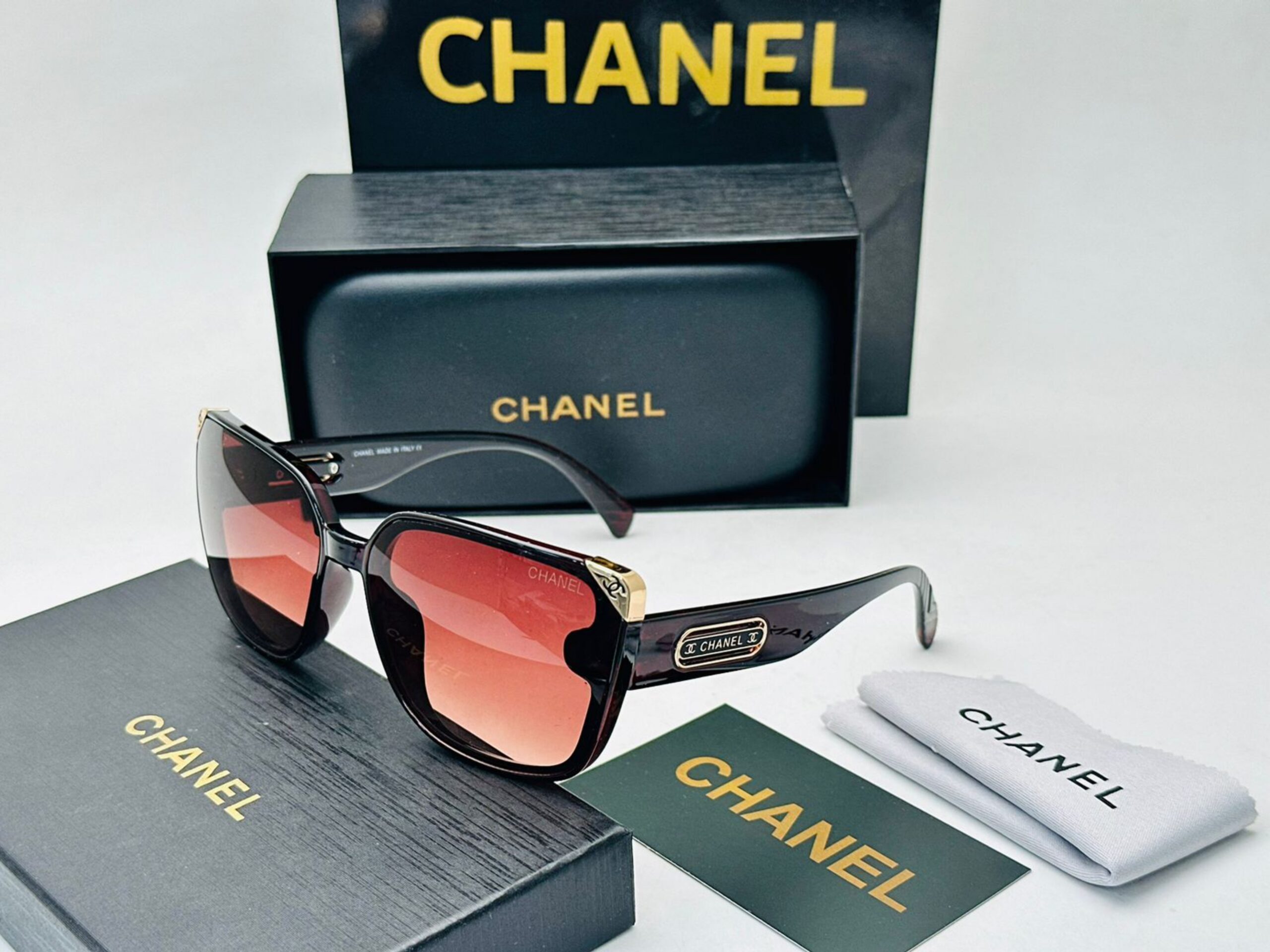 نظارة شمسية بإطار أسود وعدسات حمراء متدرجة، شعار CHANEL محفور، تأتي مع ملحقات الماركة كاملة، جودة A1:1 كوبي ون.