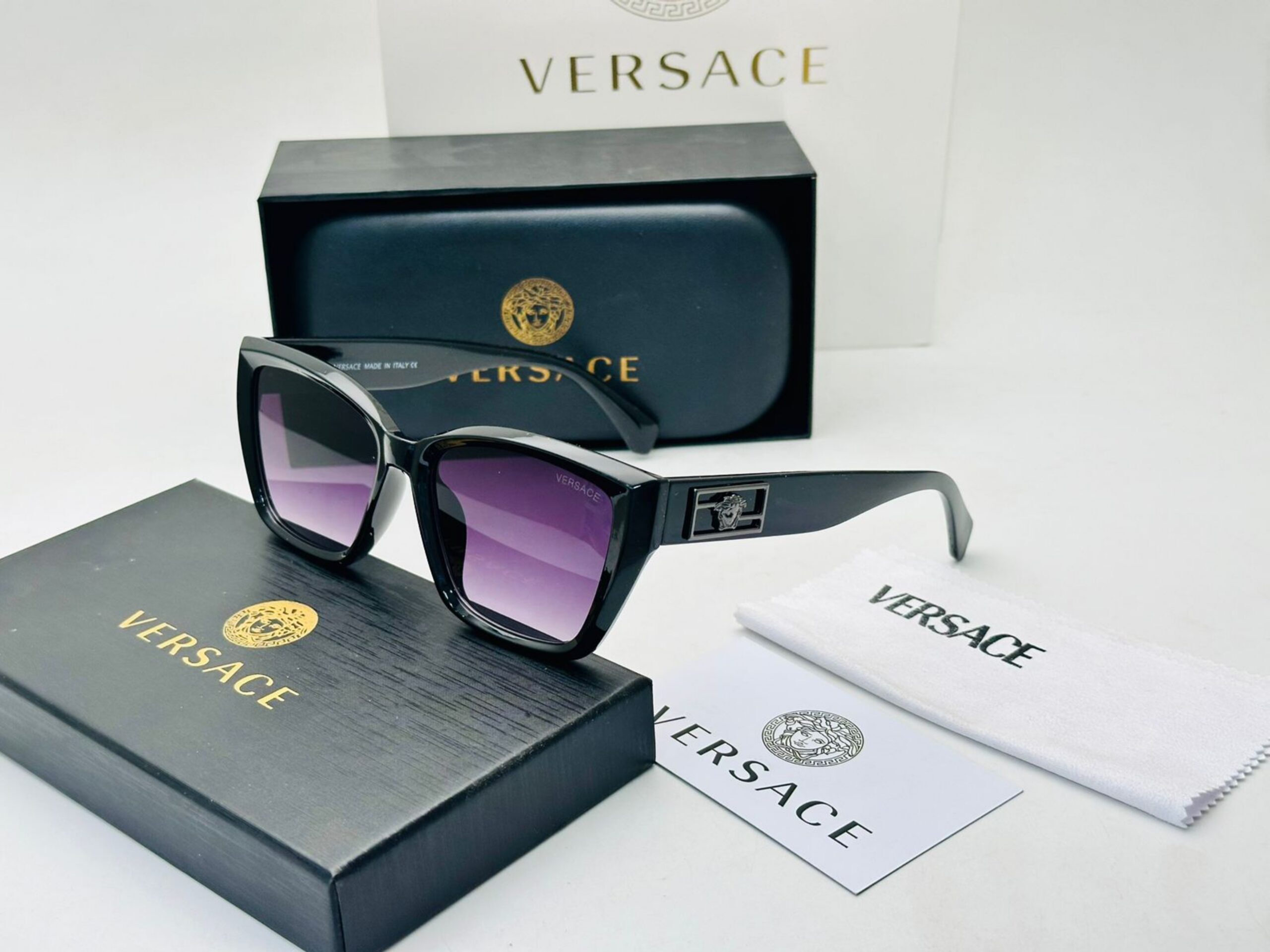 نظارة شمسية بإطار أسود وعدسات أرجوانية متدرجة، شعار Medusa الذهبي على الذراع. تأتي مع ملحقات الماركة كاملة، جودة A1:1 كوبي ون.