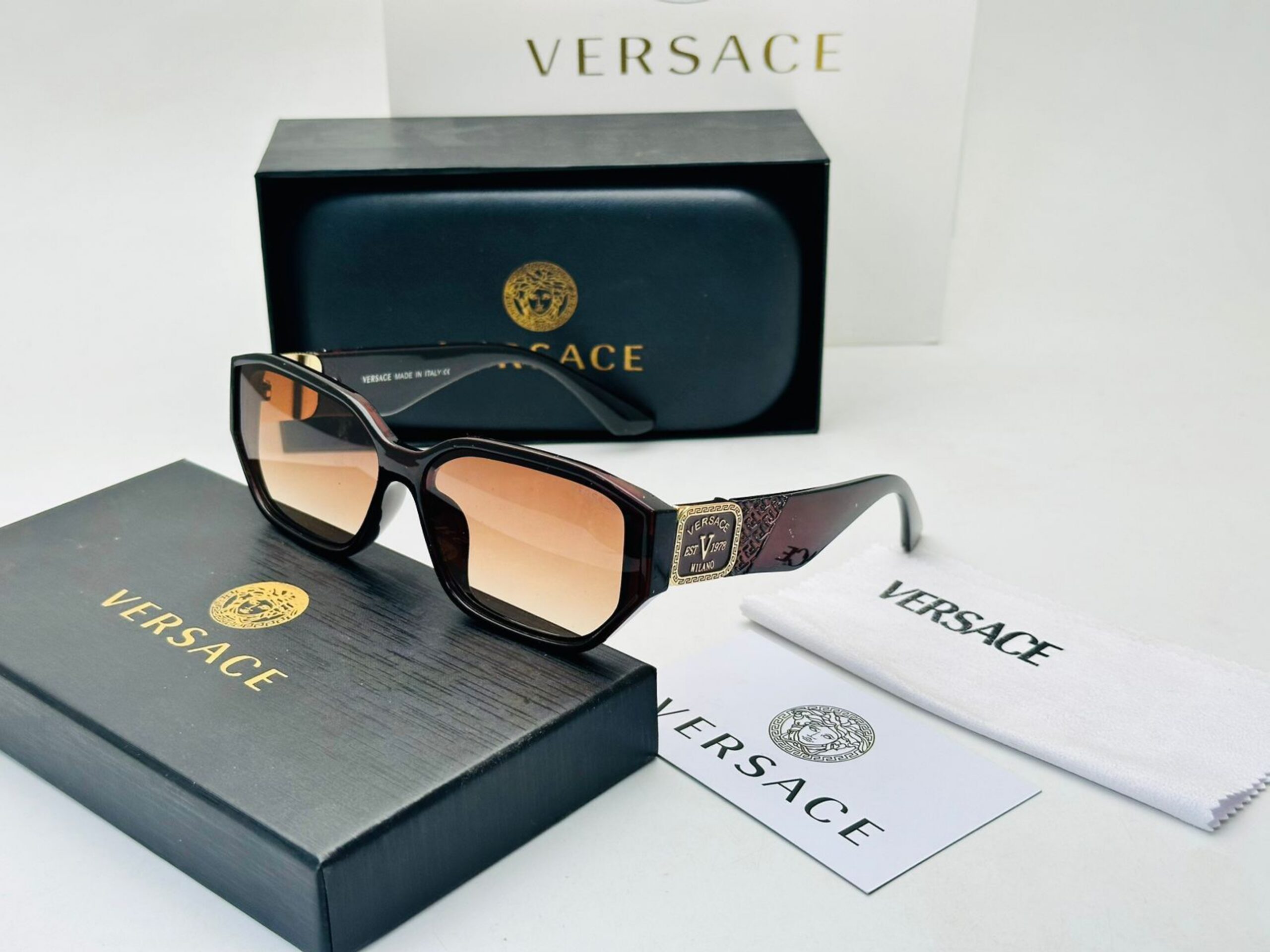 نظارة شمسية بإطار داكن وعدسات بنية متدرجة، مزينة بشعار VERSACE الذهبي على الذراع. تأتي مع ملحقات الماركة كاملة، جودة A1:1