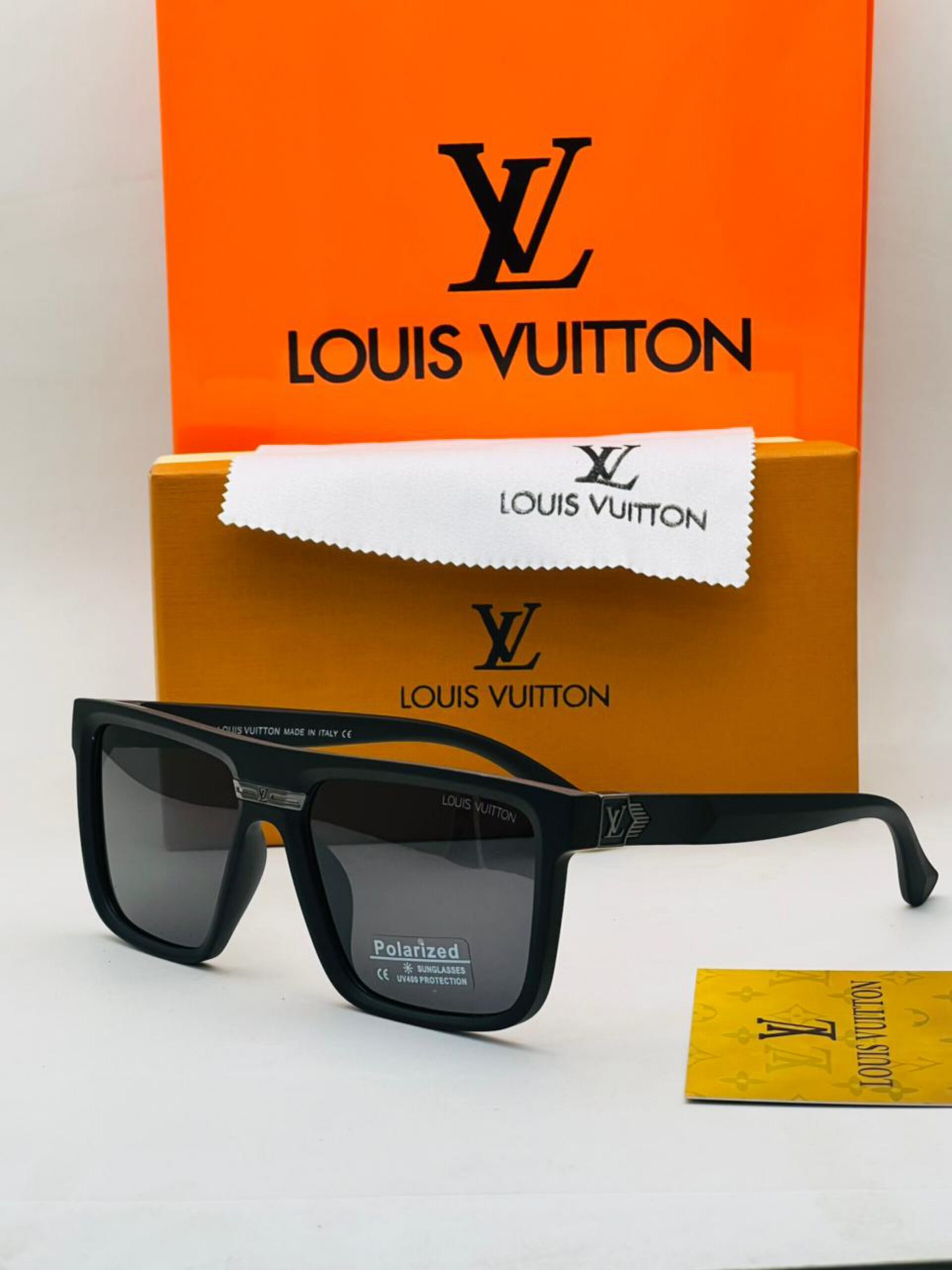 نظارة شمسية بإطار أسود وعدسات بنية مستقطبة UV400، شعار Louis Vuitton محفور على الذراع والعدسة، تأتي مع ملحقات الماركة كاملة، جودة A1:1 كوبي ون.