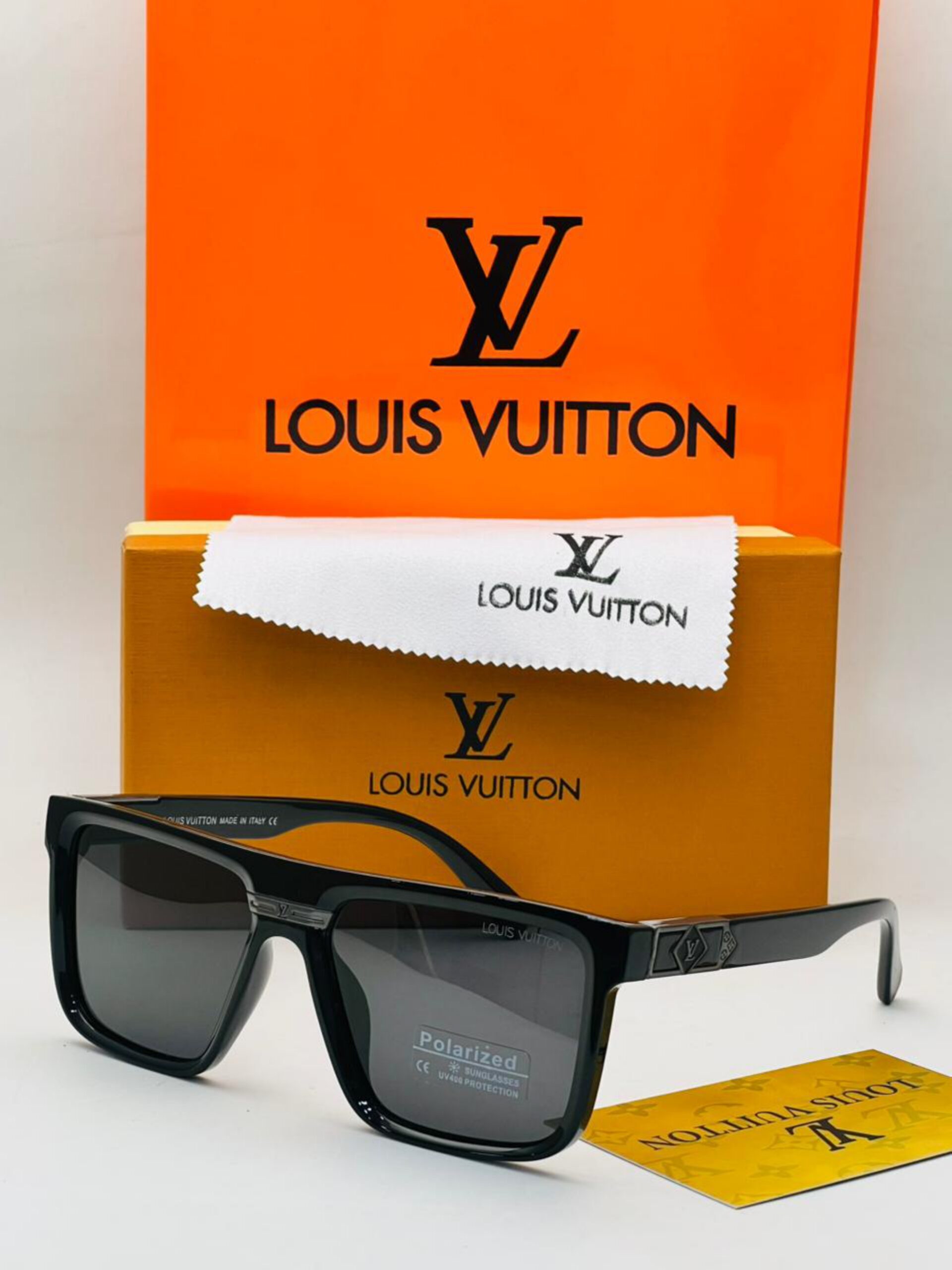 نظارة شمسية فاخرة بإطار شفاف وأذرع سوداء، وعدسات داكنة مستقطبة UV400، مزودة بزخرفة جانبية وشعار محفور. تأتي مع ملحقات الماركة كاملة، جودة A1:1 كوبي ون.